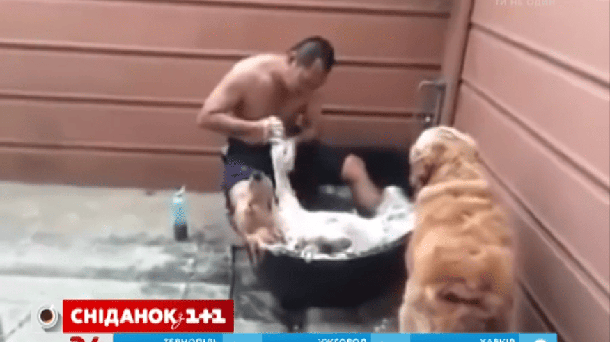 Чотирилапий зручно вмостився на спину, а господар намилює шерсть песику. Від задоволення тварина аж очі прикрила.