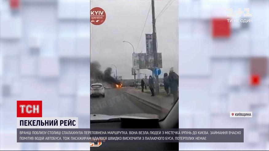 Сьогодні поблизу столиці спалахнула переповнена маршрутка. Вона везла людей з містечка Ірпінь до Києва. На щастя займання вчасно помітив водій автобуса, 25-ти пасажирам вдалося швидко вискочити з палаючого буса. На щастя ніхто не постраждав. Рятувальники приїхали швидко, але врятувати маршрутку їм не вдалося.