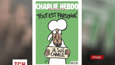 На обкладинці - ісламський пророк Магомет тримає в руках плакат із написом "Я - Шарлі", а також напис - "Усе пробачено".
