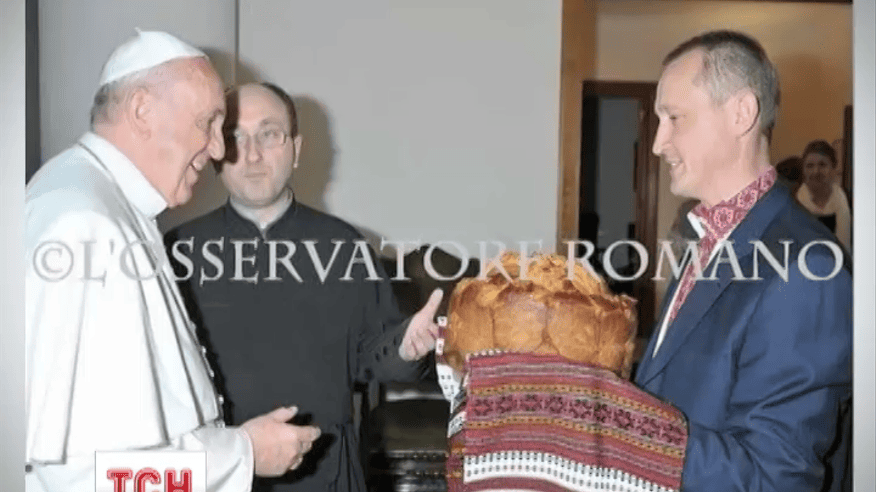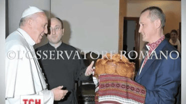 Делегація українського посольства при Святому престолі, сама вбрана у вишиване, принесла до Ватикану писанку, коровай і сорочку. Фотографій Франциска в обновці ще немає, а от кадри з вручення дарунків - з'явилися на Твіттері посольства.