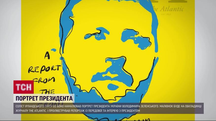Боно намалював Зеленського. Соліст ірландського гурту U2 проілюстрував у такий спосіб репортаж з передової та інтерв'ю з президентом України, його малюнок буде на обкладинці журналу "Атлантік". Портрет Володимира Зеленського на синьо-жовтому тлі має підпис "Вибір між свободою і страхом". Торік у травні учасники гурту Боно та Едж разом із гуртом "Антитіла" та українськими військовими виступили в київському метро та виконали пісню "Stand By Me" зі словами "Stand by Ukraine".