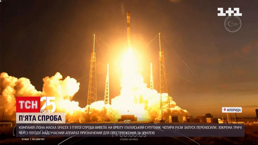 Спроба номер п'ять. Саме стільки разів знадобилося компанії Ілона Маска Спейс Ікс, щоби їхня ракета вивела на орбіту італійський супутник. Спочатку запуск планували на 27 січня, проте він переносився чотири рази. Зокрема тричі через погоду, а в неділю запуску завадила присутність корабля поблизу зони операції. До мису Канаверал, що у Флориді увійшов круїзний лайнер, а покинути територію запуску вчасно не зміг.