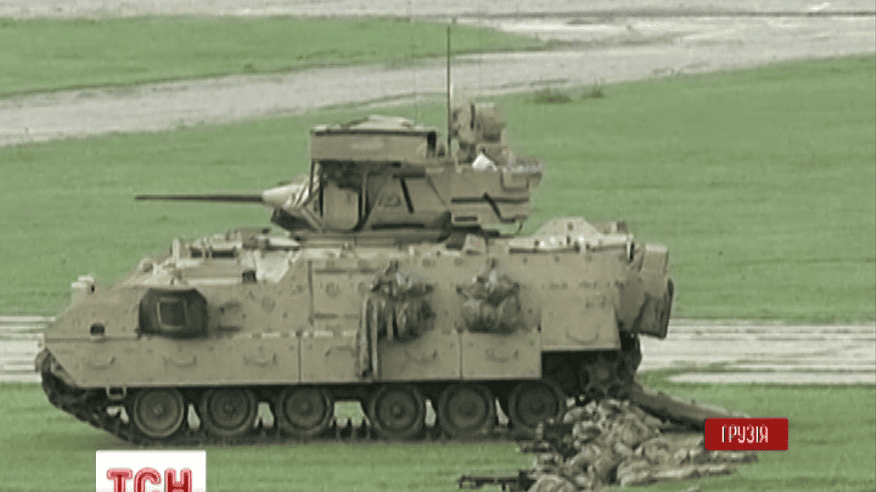 На військовій базі у Вазіані бійці за підтримки бронетехніки відпрацьовували атаку на захоплені умовним ворогом будівлі. Такі навчання проходять у Грузії вперше, участь у них беруть шість сотень військових.