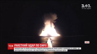 Літаки й ракети серед ночі завдали ударів по трьох цілях в районі Дамаска та Хомса, всі три - це дослідницькі інститути, які пов'язують з програмою створення хімічної зброї. Так Сполучені Штати, Британія та Франція відповіли сирійському диктатору та Кремлю на хімічну атаку міста Дума, внаслідок якої загинуло 70 та отруїлися півтисячі людей.