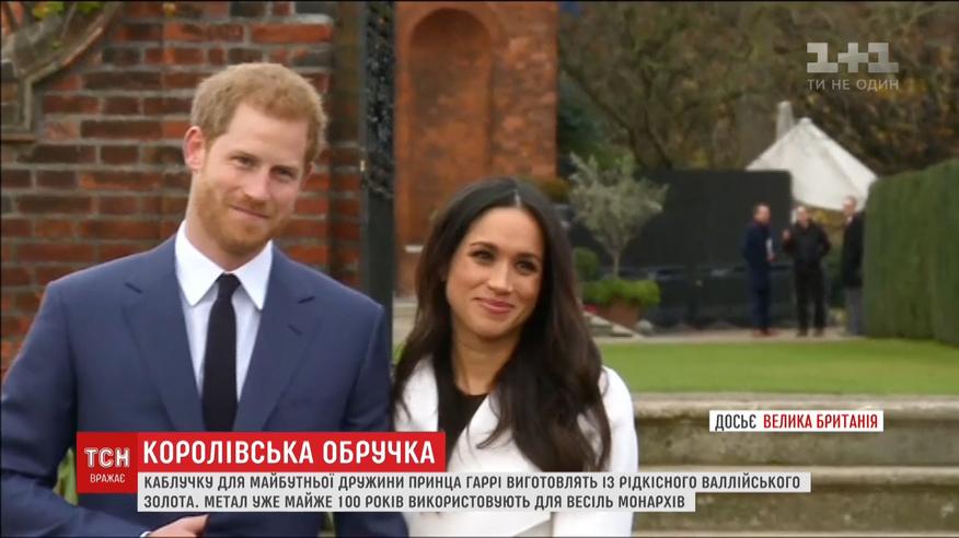 Каблучка, яку принц Гаррі одягне на палець своєї нареченої як символ їхнього шлюбу, виготовлять із валлійського золота. Перстні із цього рідкісного коштовного металу вже майже 100 років є весільною традицією британських монархів. Вперше таку обручку одягла прабабуся Гаррі – королева-мати Єлизавета. Її прикладу послідувала і Єлизавета ІІ, потім валлійське золото носила Принцеса Діана і зрештою Кейт Міддлтон після весілля з принцом Вільямом.