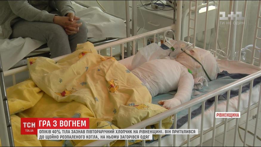 Напередодні під вечір дитина відійшла од наркозу після першої операції. У хлопчика обпечено 40% тіла. Ураження малюк дістав удома: його мама розтопила котел. Він притулився до нього і на дитині загорівся одяг. Лікарі кажуть - попереду в хлопчика ще кілька операцій та місяці реабілітації.