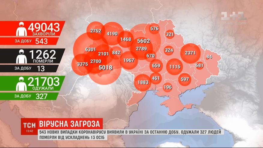543 нових випадки коронавірусу виявили в Україні минулої доби. Це майже на триста менше, ніж учора. Така оновлена статистика від Міністерства охорони здоров'я. За даними чиновників, одужали 327 душ. Померли - 13. Загалом кількість діагнозів "COVID-19" в Україні впритул наблизилася до 50 тисяч. Видужали майже 22 тисячі людей. А померли - 1262. Більше про коронавірус в Україні