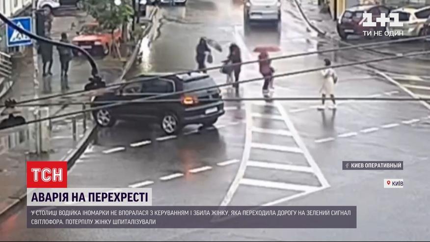 Збила на пішохідному переході. У столиці водійка іномарки не впоралася з кермуванням, повертаючи на перехресті, і просто знесла з дороги жінку, яка саме переходила вулицю на зелений сигнал світлофора. Як це сталося - зафіксувала камера спостереження. Постраждалу жінку шпиталізували. До приїзду медиків першу допомогу їй надавали патрульні, які прибули на місце аварії.