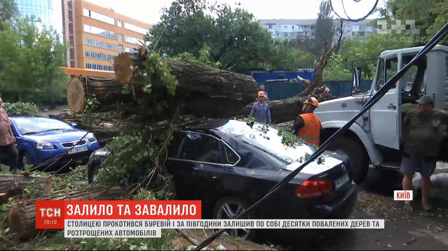 У Києві пройшла сильна злива, яка затопила шляхи і повалила дерева. Машини буквально плавали проспектами, а деякі - просто глухнули в глибоких калюжах. А от у самісінькому центрі, поблизу Офісу президента, розчахнулося дерево і впало на два автомобілі.