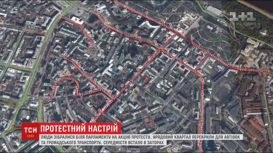 Середмістя столиці, де розташовані ВР та Адміністрація президента, оточили посилені наряди правоохоронців. Там збираються учасники акції протесту. Як наслідок - великі проблеми у водіїв, вони стоять у заторах. Частково перекриті вулиці Грушевського та Інститутська, повністю - Лютеранська, Городецького, Шовковична.