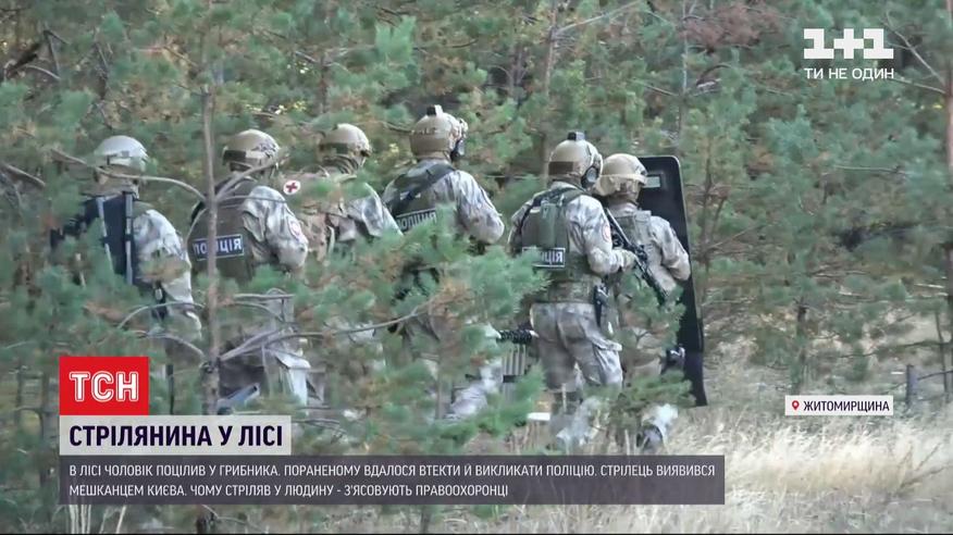 У Житомирській області чоловік поцілив у грибника. Пораненому дивом вдалося втекти. На його виклик прибули спецпризначенці. Виявилось, за двома жителями села Біла Криниця, які пішли у ліс по гриби, рушив дачник. Там підкрався до одного з грибників, і вистрелив у нього. Коли до стрілка на дачу прибули правоохоронці, він вже втік.
