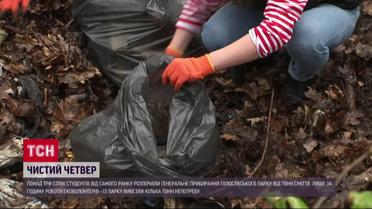Чисті парки в Чистий четвер. Понад три сотні студентів від самого ранку 13 квітня розпочали генеральне прибирання Голосіївського парку в Києві від тонн сміття. До збору пластика, скла, картону та навіть автомобільної гуми долучився і міністр захисту довкілля та природних ресурсів Руслан Стрілець. За словами чиновника від екології - нині і цей парк, і більшість інших просто захлинаються в смітті, яке люди чомусь залишають після себе у великій кількості. Лише за годину роботи ековолонтерів із Голосіївського парку вивезли кілька тонн непотребу.