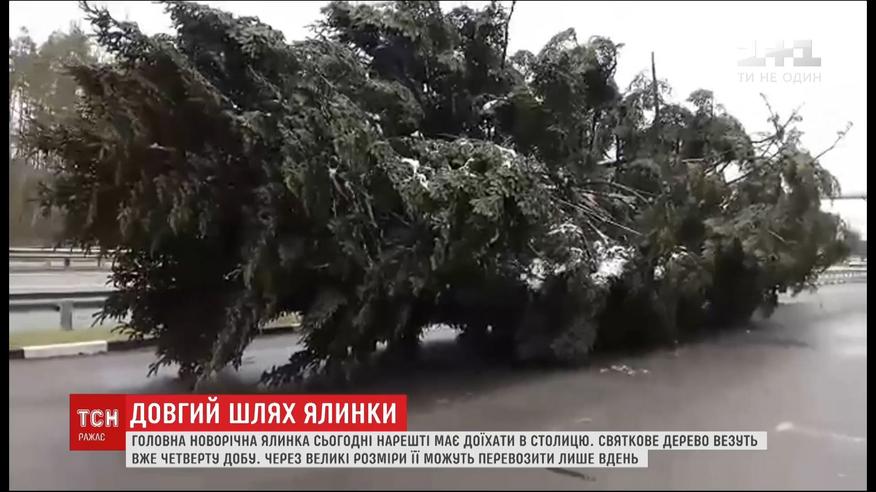 Святкове дерево мандрує вже четвертий день. Його везуть тягачем і це перевезення дозволене тільки вдень. Все - через великі розміри - 28 з половиною метрів довжини та діаметр крони 7 метрів. Тягач примудрився застрягти під Львовом, у місті Стрий.