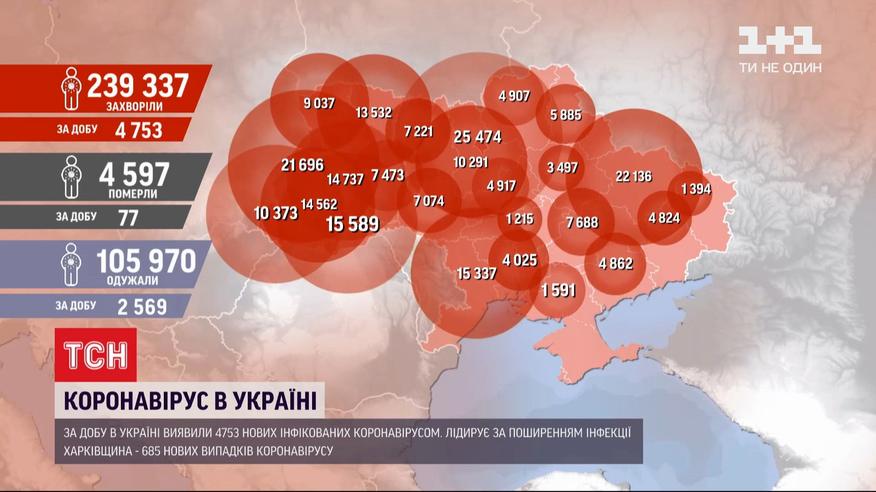 4 753 нових інфікованих коронавірусом виявили в Україні минулої доби. Так багато не було ще ніколи. У Харківській області нових діагнозів найбільше - 685. З них левова частка саме у Харкові. На загал по Україні - понад 2,5 тисячі пацієнтів за добу одужали, 77 людей - померли.