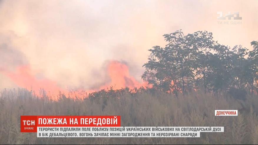 Горить на передовій. Терористи трасуючими кулями підпалили поле поблизу позицій на Світлодарській дузі в бік Дебальцевого. Загрожує цей вогонь не лише військовим, а й місцевим. До того ж, вогонь зачіпає мінні загородження та нерозірвані снаряди. Спрогнозувати, в який бік полетить усе це, неможливо, тому й небезпечно для бійців.