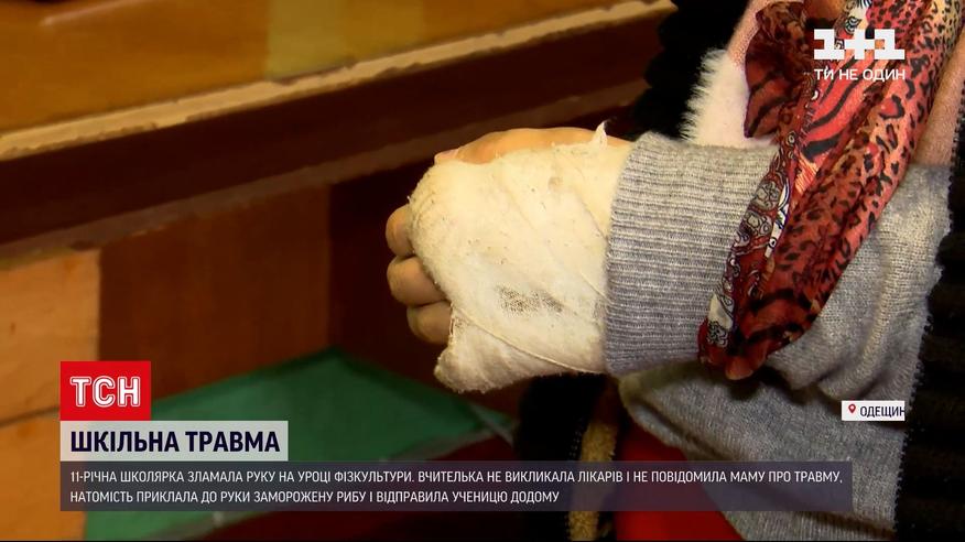 Приклали до перелому заморожену рибу та відправили додому. В Одеській області шестикласницю, яка зламала руку на уроці фізкультури, залишили без допомоги. Їй не лише не викликали "швидку", а й навіть мати дитини про травму не повідомили.