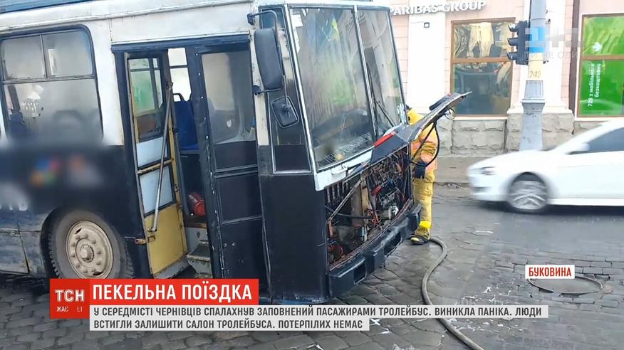 Тролейбус у вогні: це сталося у Чернівцях о восьмій ранку, коли у салоні було повно людей. Тролейбус саме їхав центральною вулицею, коли кондукторка помітила дим і сказала водію. Той зупинив тролейбус та відчинив двері: виникла тиснява, адже одночасно з салону намагались вибігти сорок пасажирів.