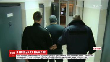 32-річному чоловікові лише дивом вдалося втекти. Як він розповів поліції, невідомі увірвалися в квартиру, яку потерпілий орендував у Києві, побили його і перевезли до Житомира. Там замкнули у його ж гаражі і два дні били, вимагаючи переписати на них житомирську квартиру. Чоловіку вдалося втекти через запасний вихід, про який викрадачі не знали.