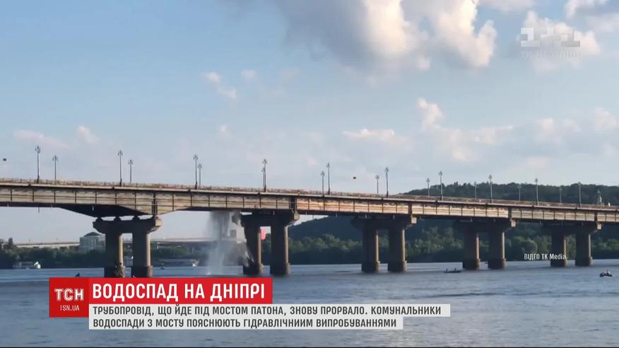 Водоспад посеред Дніпра. Водогін на мосту Патона у столиці знову прорвало. Вже вдруге за два тижні. Комунальники водоспади з переправи пояснюють гідравлічними випробуваннями - нібито спеціально шукають слабкі місця, аби під час опалювального сезону не повторилася історія, що трапилася в березні.