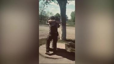 Батько і син зустрілися у Бахмуті. Прикордонник з позивним "Малий" обіймає свого батька. Позивний військового "Прапор", і він також боронить місто-фортецю.