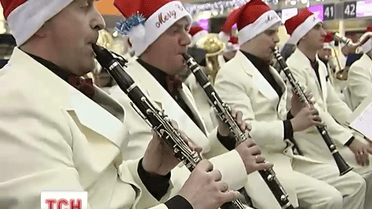 Музиканти Київського муніципального духового оркестру перевтілилися і впродовж двох годин виконували у залі вильоту шедеври світової класики та популярні різдвяні хіти.
