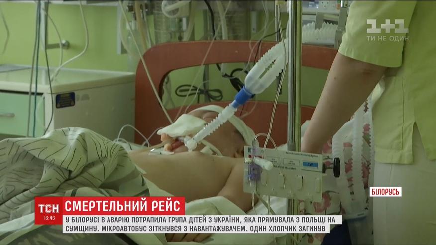 Двоє з них ще в дуже тяжкому стані, чотирьох із черепно-мозковими травмами можливо за кілька днів можна буде відправити в Україну. Але тільки у ледачому стані, наголошують медики. У неділю мікроавтобус, в якому було 26 дітей із Сумщини, на території Білорусі врізався у навантажувач.