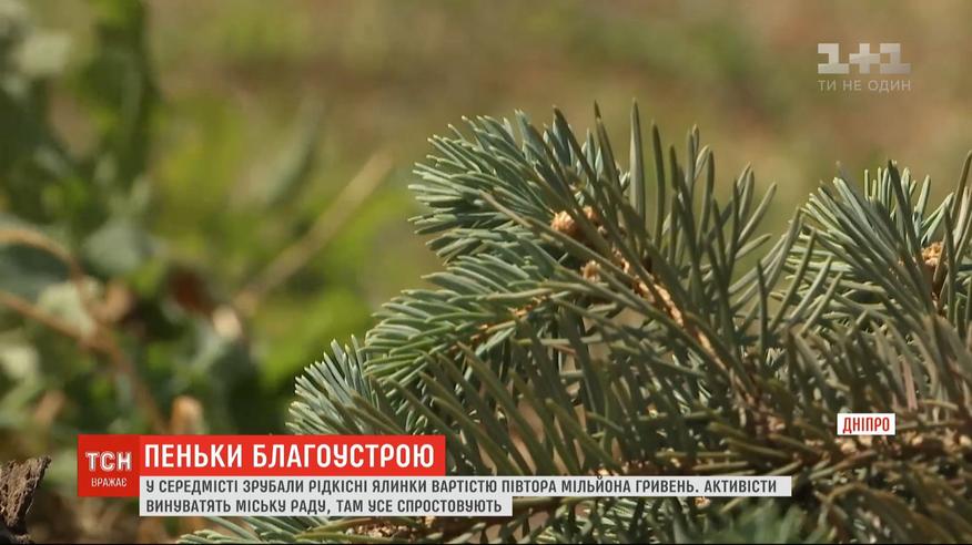 Вирубка у центрі Дніпра. Там спиляли понад десяток ялинок, вартістю півтора мільйона гривень. Галявину з рідкісними блакитними ялинами знищили біля цирку, на місці лишили лише стовбури. Активісти переконані, що міська влада свідомо звільнила місце під черговий паркувальний майданчик. У мерії намагаються спростовувати всі закиди. Кажуть, дозвіл давали на благоустрій території і аж ніяк не на вирубку дерев. Розслідуванням справи зайнялася поліція.
