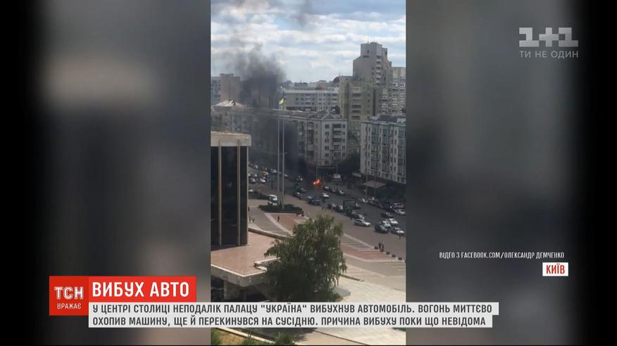 Вибух авто в центрі української столиці. Слідом за позашляховиком, зайнялася ще одна машина. Кадри охопленого полум'ям елітного позашляховика навпроти "Палацу "Україна" зафільмували випадкові самовидці. Усе відбулося за лічені хвилини. Вибух пролунав по обіді, полум'я перекинулося ще й на сусіднє авто. За 10 хвилин рятувальники вже ліквідували пожежу, однак обидва автомобілі вигоріли вщент. Минулося без потерпілих. Причину займання правоохоронці наразі встановлюють.