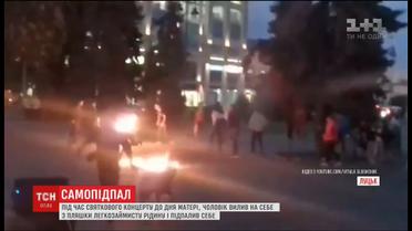 Це трапилося під час святкового концерту до Дня матері. Як кажуть очевидці, чоловік бешкетував. Втихомирити його попросили поліцію. Коли копи підійшли до бешкетника, він миттєво вилив щось на себе з пляшки, підпалив запальничкою і спалахнув з ніг до голови. Очевидці намагалися загасили вогонь власним одягом. З опіками чоловіка доправили до лікарні.