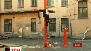 Інсталяцію з прибитою до хреста лялькою російського президента розмістили на подвір'ї колишньої будівлі КДБ. Зробили це у рамках мистецького проекту.