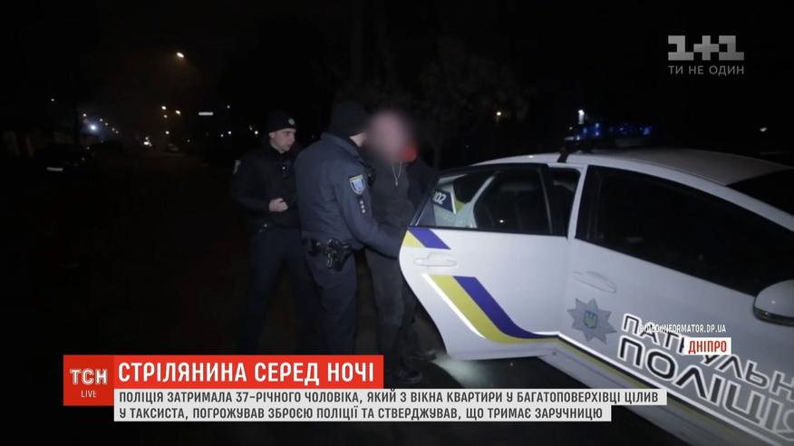 У Дніпрі затримали 37-річного чоловіка, який із травматичної зброї стріляв у таксиста, що саме запаркувався біля під'їзду житлового будинку. Чоловік із вікна другого поверху спершу сварився на автомобіліста, а зрештою - поцілив йому у живіт. На місце прибули патрульні та спецзагін. Стрілець погрожував їм зброєю і твердив - утримує заручницю.