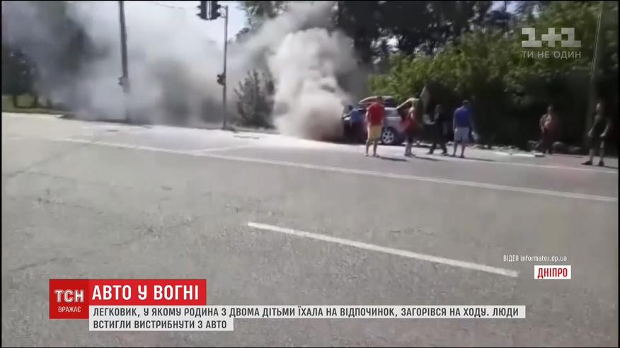 У Дніпрі просто під час руху загорівся легковик. Родина з двома дітьми саме їхала на відпочинок. Вони встигли вистрибнути з кросовера. Водій розповів: виїжджав із міста, коли побачив дим з-під капота. Ледве встиг зупинитися, як машину охопило полум'я. Інші водії намагалися загасити авто з вогнегасників, проте марно. Рятувальники, що прибули на виклик, побороли вогонь за шість хвилин, проте транспорт відновленню не підлягає.