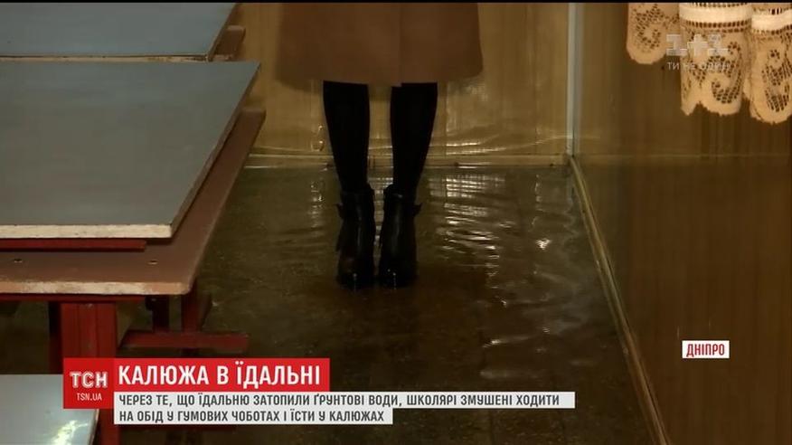 Їдальню школи в середмісті Дніпра раптово затопило ґрунтовими водами. Тож у школі довелося робити саморобні містки до столів, викачувати воду підручними засобами, а дітям взуватися як на прогулянку під дощем.