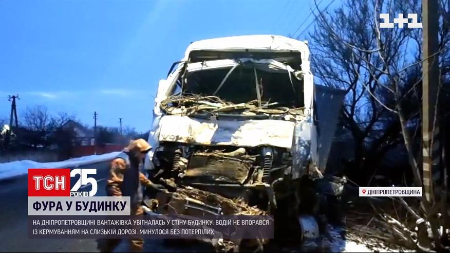 Фура влетіла у будинок. У Дніпропетровській області вантажівка, що перевозила контейнер, увігналась у хату. Водій не впорався з кермуванням. Його, імовірно, занесло на слизькій мокрій дорозі. В результаті автівка злетіла з траси і опинилась у стіні дому. Будинок склався наче картковий. Дах лежить на землі.
