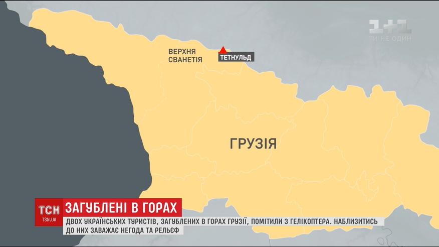Двох українських туристів помітили з гелікоптера. Екстремали загубилися в горах Сванетії на висоті понад 4 тисячі метрів два дні тому, відбившись від основної групи. Напередодні їх помітили з гелікоптера. В якому вони стані - невідомо. Наблизитись до них заважає негода та складний місцевий рельєф.