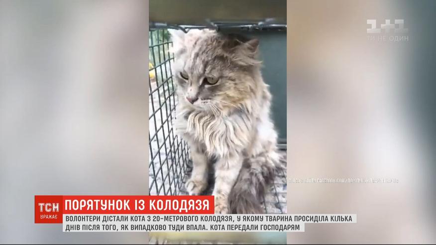 Справжню рятувальну операцію влаштували у містечку Ізюм у Харківській області. І все, аби звільнити сірого кота із занедбаного колодязя. Два дні вусань волав із пастки, але дістати його люди не могли. Зрештою, на допомогу покликали волонтерів. Один із них на мотузці спустився на 20-метрову глибину, інші страхували нагорі. Переляканий кіт спершу не давався до рук, але його таки вдалося посадити до клітки, аби підняти.