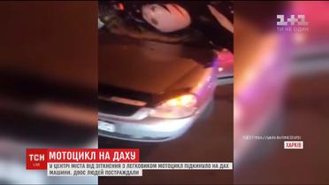 У Харкові від зіткнення з легковиком мотоцикл підкинуло на дах авто, є постраждалі