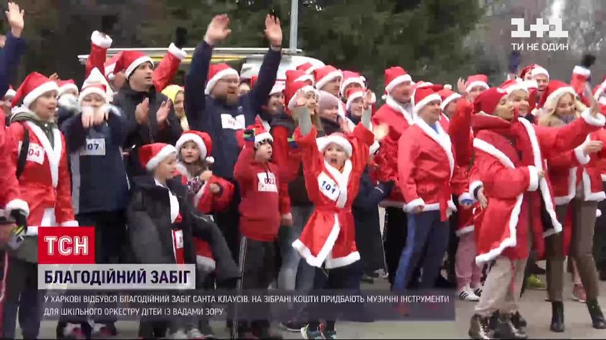 Благодійний забіг Санта Клаусів у Харкові. Бігли в новорічних костюмах і професійні спортсмени, і родини з дітьми. Змагались у марафоні і люди на інвалідних візках. Для участі треба було сплатити благодійний внесок і вдягнути костюм Санти або хоча б шапку. На зібрані кошти придбають музичні інструменти для шкільного оркестру дітей із вадами зору. Цього року кількість учасників була рекордною - понад 300. Забіг Санта Клаусів відбувається в Харкові вже 5 рік поспіль.