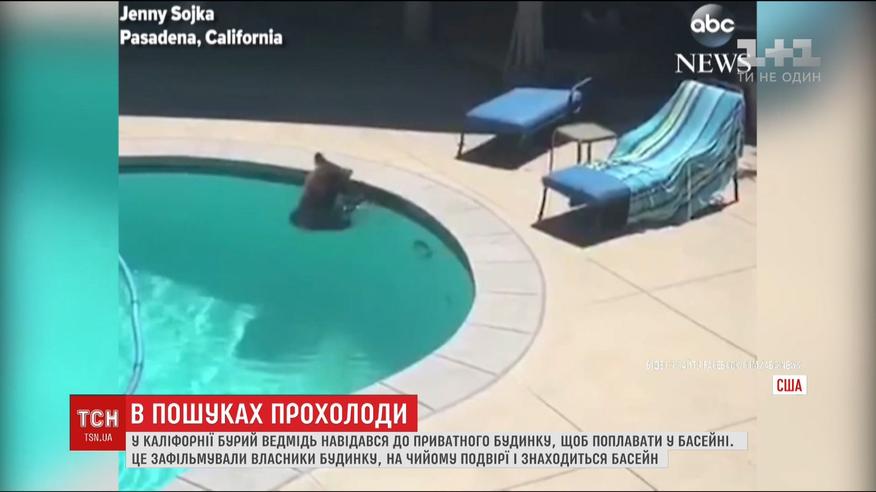 Мешканці міста Пасадена, що в південному штаті Каліфорнія, зафільмували, як до їхнього басейну біля будинка навідався клишоногий. Дикий гість діловито підійшов до басейну, акуратно зліз в нього і почав шувбовсатися у воді. Зараз у Пасадені - спека за 30 градусів. І, очевидно, ведмедю просто захотілось освіжитися.