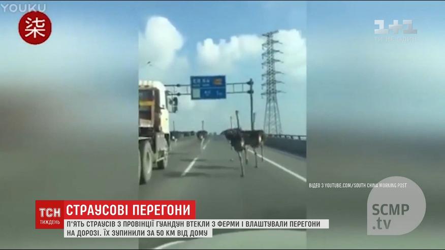 У Китаї п'ятеро страусів влаштували перегони поміж машин на трасі