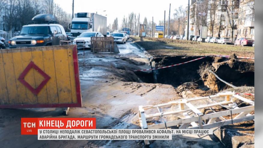 У столиці неподалік Севастопольської площі провалився асфальт. Трапилось це внаслідок прориву водопроводу уночі. На місці працює аварійна бригада. Маршрути громадського транспорту змінили.