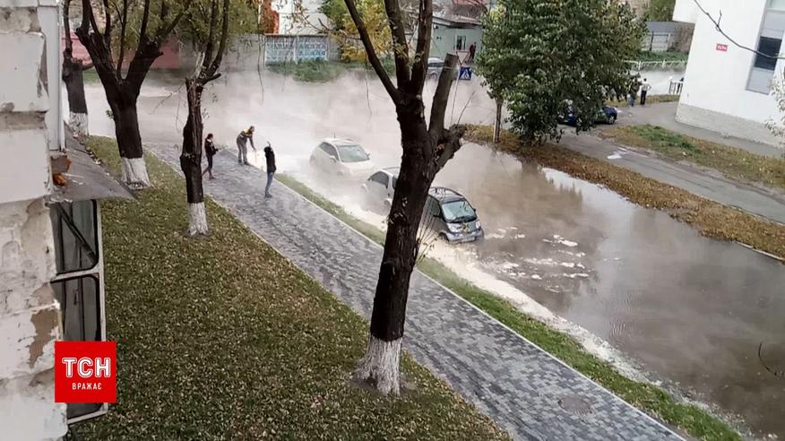 У Києві окроп, який напором бив з-під землі, затопив декілька припаркованих авто