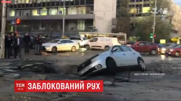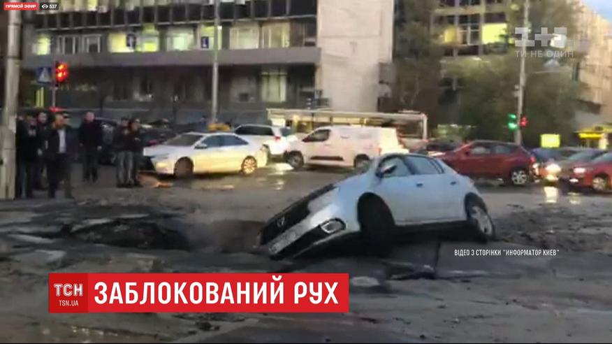 У центрі столиці прорвало гарячу трубу. Вода буквально розплавила асфальт. В результаті утворилося дві ями, в одну з них на швидкості провалилася автівка. Невідомо, чи є постраждалі. Наразі місце інциденту перекрито, працюють правоохоронці.