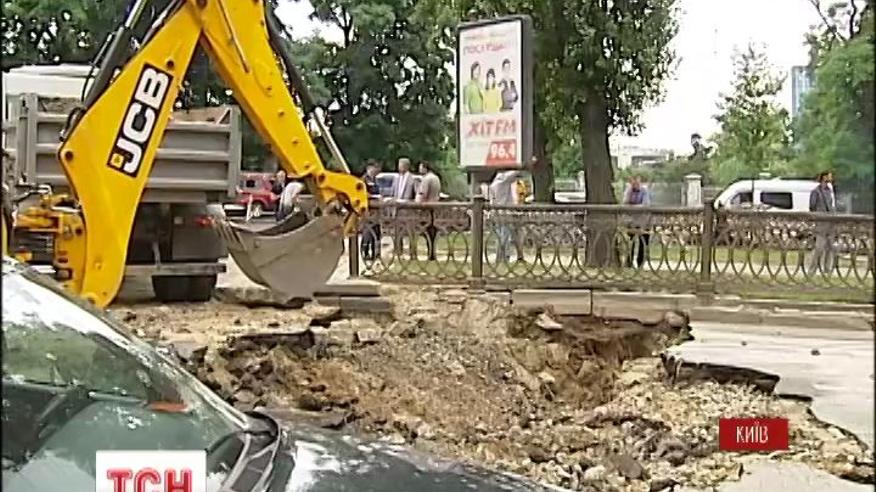 І все через те, що "Київенерго" вирішив під тиском випробувати тепломережі. В результаті поламаний асфальт, величезна яма, каміння розкидане на десятки метрів.