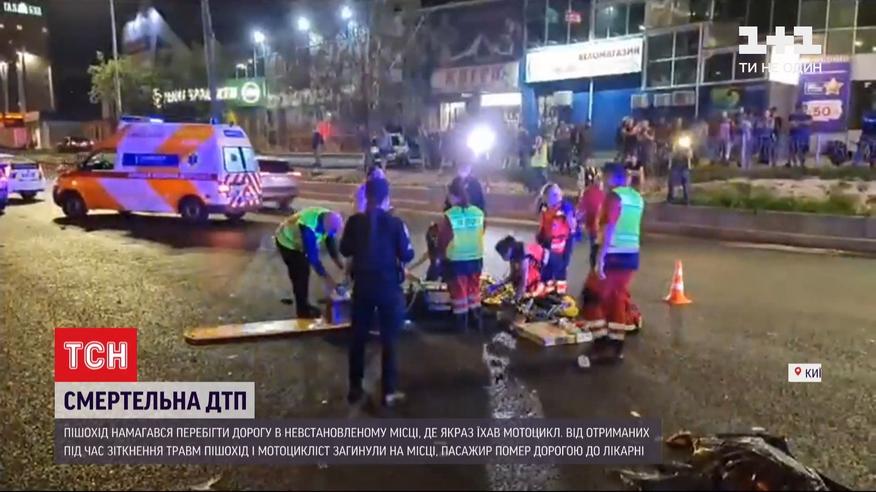 Троє людей загинули в дорожній аварії у Києві. Пішохід намагався перебігти дорогу в невстановленому місці, і в цей момент там їхав мотоцикл. Від отриманих травм пішохід і мотоцикліст загинули на місці. Пасажир мотоцикла помер у кареті "швидкої" дорогою до лікарні. Сталося це на проспекті Гузара, де курсує швидкісний трамвай. І там є облаштовані підземні переходи. Тож чому пішохід вирішив перебігти дорогу через проїжджу частину - мають встановити слідчі. Як і те, із якою швидкістю їхав мотоцикл. За словами свідків - вона була більшою ніж 100 кілометрів за годину.