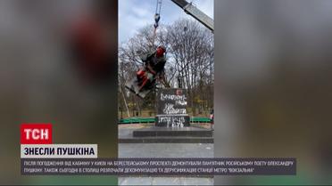 У Києві знесли пам’ятник російському поету Олександру Пушкіну. На місці пам'ятника залишився п'єдестал, вкритий написами. Сам парк Пушкіна теж перейменують. Цим займатиметься спеціальна комісія з перейменування після голосування громадян за обрані варіанти в "Києві Цифровому". Також в столиці розпочали декомунізацію та дерусифікацію станції метро "Вокзальна". Деталі – в ТСН.