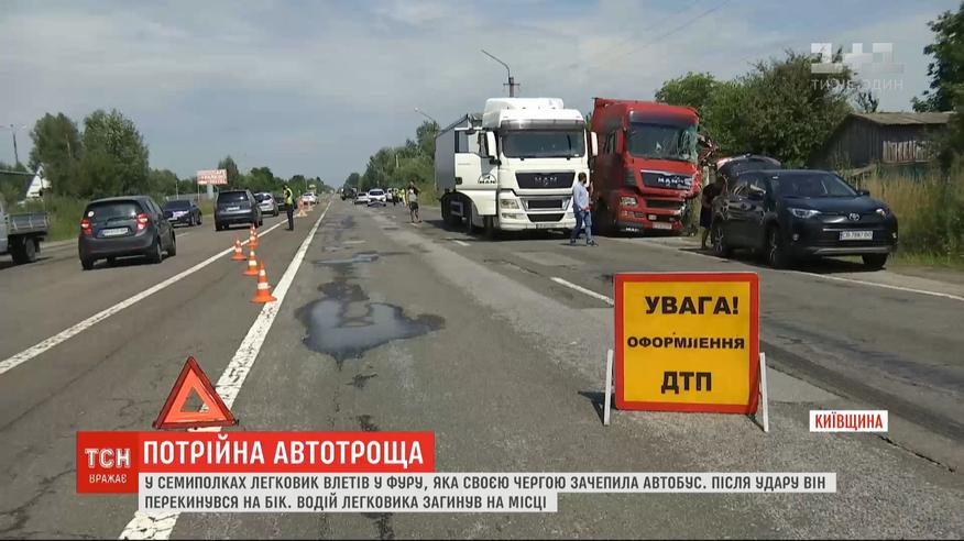 Потрійна ДТП в Семиполках Київської області. Легковик влетів у фуру, а та, своєю чергою, зачепила автобус, який після зіткнення злетів у кювет та перекинувся на бік. Пригода сталася о 5 годині ранку. Під час аварії одна людина загинула, ще 9 отримали травми. Деталі автотрощі – у сюжеті.