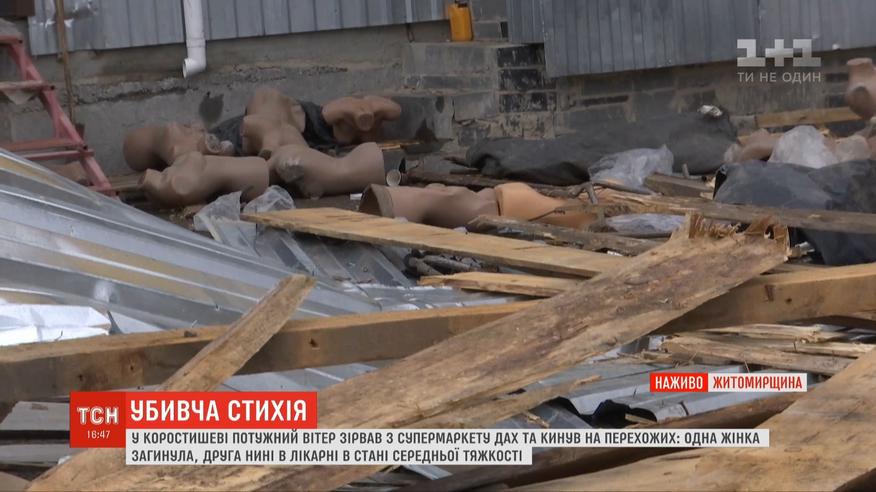 Шалений вітер не вщухає і вже накоїв чимало лиха. Троє людей загинули. Зокрема, на Житомирщині на двох жінок упав зірваний вітром дах супермаркету: одну врятувати не вдалося, інша - в реанімації.