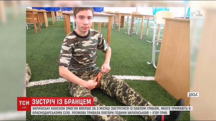 Українські консули добилися побачення із Павлом Грибом у краснодарському СІЗО. Це перша зустріч за 3 місяці. Про це повідомив батько затриманого, Ігор Гриб на своїй сторінці у Facebook. За його словами, із 19-річним бранцем розмовляли півтори години українською мовою. Минулу зустріч у листопаді керівництво СІЗО перервало на 7-ій хвилині саме через те, що говорили українською. Консули розповіли батькові, що Павло блідний, скаржиться на здоров'я, а тамтешні лікарі не дають вживати жодних препаратів.