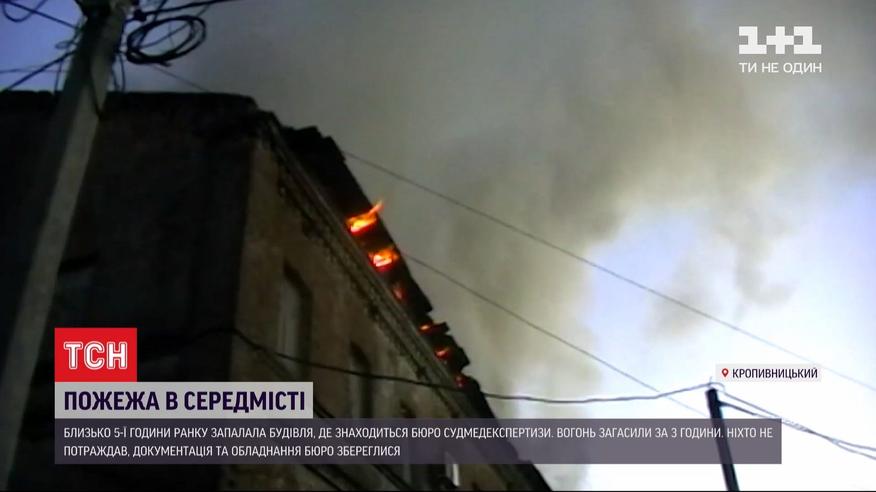 Пожежа у середмісті Кропивницького, там палала історична будівля, де нині розташоване бюро судово-медичних експертиз. Зайнялося близько п`ятої ранку на останньому поверсі. Вогонь швидко поширився на дах, вигоріло близько 200 квадратних метрів покрівлі. Горіло так, що заграву було добре видно в багатьох районах міста, гасили вогонь 3 години. Під час пожежі ніхто не постраждав, уся документація та обладнання бюро судмедекспертизи збереглися. Щодо причин займання, версії слідчі розглядають різні. Наймовірніше, кажуть, сталось закорочення.